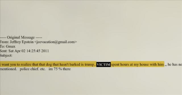 เช่นฉบับวันที่ 2 เมษายน 2011 ที่เอปสตีนส่งถึงแมกซ์เวลล์ ผู้ช่วยหญิงที่กำลังต้องโทษในคดีสมรู้ร่วมคิดและเป็นคนจัดหาเด็กหญิงให้เอปสตีน โดยเอปสตีนเขียนว่า “อยากให้คุณรู้ว่า ‘หมาที่ไม่เห่า’ ตัวนั้นคือทรัมป์… [ชื่อเด็กหญิงที่เป็นเหยื่อ] ใช้เวลาหลายชั่วโมงกับเขาที่บ้านของฉัน เขาไม่เคยเอ่ยถึงเลย (กับ) หัวหน้าตำรวจ และ ฯลฯ ฉันมั่นใจ 75% แล้ว”