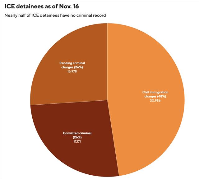 อย่างไรก็ดี ประมาณ 30,986 คน หรือ 48% ของผู้อพยพที่ถูกกักกันตัวอยู่ในเวลานี้ ไม่เคยถูกตั้งข้อหา หรือเคยถูกตัดสินว่ามีความผิดในคดีอาชญากรรม แต่ถูกกักตัวเพราะละเมิดกฎหมายคนเข้าเมือง ซึ่งเป็นความผิดคดีแพ่งเท่านั้น