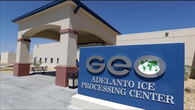 1 Adelanto ICE Processing Center ศูนย์กักกันขนาดใหญ่ในเมือง อเดลลานโต ย่านทะเลทรายในซานเบิร์นนาดิโน่ เคาน์ตี้ ดำเนินการโดย GEO Group