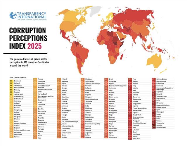ดัชนีภาพลักษณ์คอร์รัปชัน (Corruption Perceptions Index – CPI) ปี 2025 ของ องค์กรเพื่อความโปร่งใสนานาชาติ (Transparency International) เปิดเผยเมื่อวันที่ 10 กุมภาพันธ์ 2026 ชี้ว่าสหรัฐฯ มีอันดับภาพลักษณ์ต่ำสุดในรอบสิบปี กล่าวคือร่วงจากอันดับ 28 ไปอยู่ที่ 29 จากทั้งหมด 182 ประเทศ