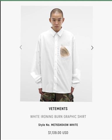 สินค้าใช้ชื่อว่า เสื้อเชิ้ตกราฟิกรอยเตารีดไหม้สีขาว (the White Ironing Burn Graphic Shirt) มาในทรงโอเวอร์ไซซ์ มีลายที่ดูเหมือนรอยไหม้ของเตารีดบริเวณใกล้กระเป๋าอก โดยรอยดังกล่าวถูกพิมพ์ไว้เป็นส่วนหนึ่งของดีไซน์เสื้อ