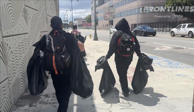 เจ้าหน้าที่เก็บกวาดต้องแบกถุง “เซ็กซ์ทอย” หลังแอ่นหลังเสร็จการชุมนุม “ต่อต้านไอซ์” หน้าเรือนจำกลางย่านดาวน์ทาวน์แอลเอ เพราะกลุ่มผู้ประท้วงนำ “ของเล่นผู้ใหญ่” หลายร้อยชิ้นมาแปะและขว้างปาเต็มพื้นที่