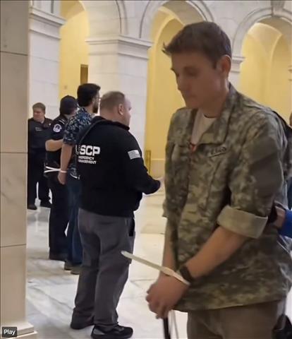ผู้ประท้วงยังจัดพิธีพับธงชาติเพื่อสื่อถึงทหารอเมริกัน 13 นายที่เสียชีวิตในสงคราม พร้อมตะโกนคำขวัญต่อต้านสงคราม ก่อนถูกเจ้าหน้าที่ตำรวจรัฐสภาเข้าควบคุมตัวและใส่กุญแจมือ
