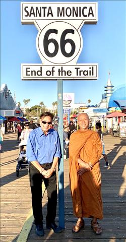 “...คือธุดงควัตร 13 ข้อนี่ มีอยู่ข้อหนึ่ง ก็คือจะต้องตระเวนเดินเผยแผ่ไปเรื่อย จะไม่ซ้ำที่นะ แม้ต้องปักกลดตามข้างถนน ช่วงแรกจะมี “พี่วิลลี่” (วิลลี่ วัฒนวงศ์คีรี) กับ “โยมนุค” (สถิรวัจน์ เศาภายน) คอยช่วยประสานงานให้ ส่วน “พี่วิลลี่” จะดูแลในช่วงแคลิฟอร์เนียไปจนถึงบาร์สโตว์ แล้ว “โยมนุค” เจ้าของร้านบ้านไทย ในลาส เวกัส จะมารับผิดชอบต่อ ซึ่งเขาปวรณาว่าเขาจะดูแลยี่สิบวันเลย ซึ่งก็คงจะเดินพ้นเขตเนวาด้า เพราะว่าช่วงที่เดินจากบาร์สโตว์ ไป ลาส เวกัส เนี่ย มันร้อยหกสิบไมล์ ซึ่งก็ตั้งเป้าว่าจะเดินให้เสร็จภายในสี่หรือห้าวัน เพราะว่าถ้ามีคนดูแลเรื่องที่พักเนี่ยก็จะเดินง่าย แต่ถ้าจะต้องมาคอยกังวลว่าจะต้องฉันตรงไหน ที่พักยังไง ก็จะทำให้มีภาระเพิ่มขึ้นและการเดินจะมีประสิทธิภาพน้อยลง...